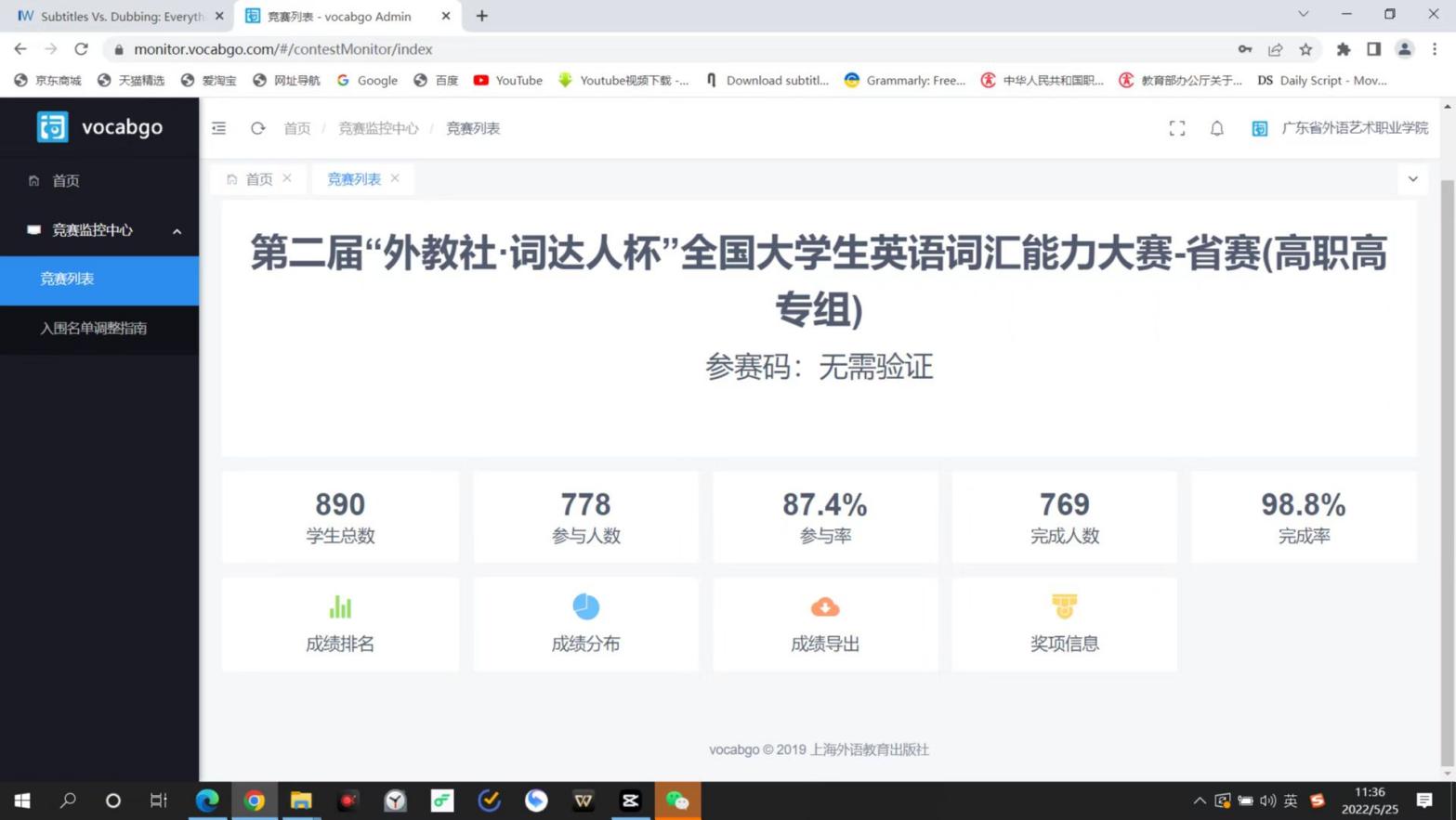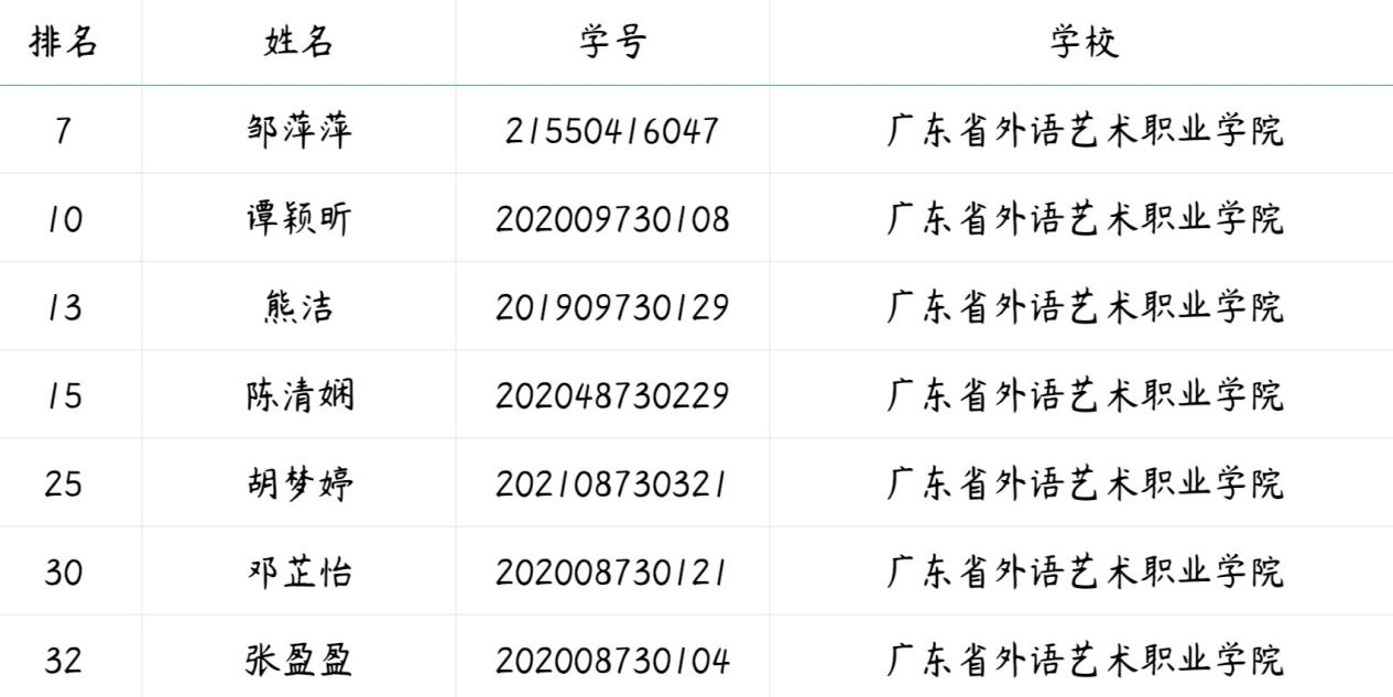 近日,经过校赛激烈角逐,我校选派了37名选手参加了由上海外国语大学中国外语战略研究中心、中国外语教材与教法研究中心和外教社主办,依托外教社“词达人”英语词汇智慧学习平台在线举办的第二届“外教社·词达人杯”全国大学生英语词汇能力大赛广东省省赛。