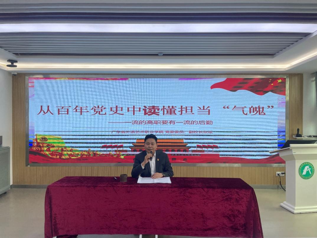 张斌以《从百年党史中读懂担当“气魄”——一流高职要有一流后勤》为主题展开,结合筚路蓝缕、奠基立业的百年党史,引出广大党员干部需要从党波澜壮阔的奋斗史中汲取“四气”为精神粮食:即艰苦奋斗的朝气、团结协作的大气、迎难而上的锐气、无私奉献的正气。