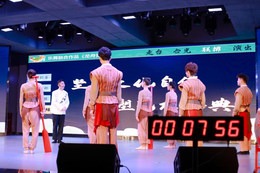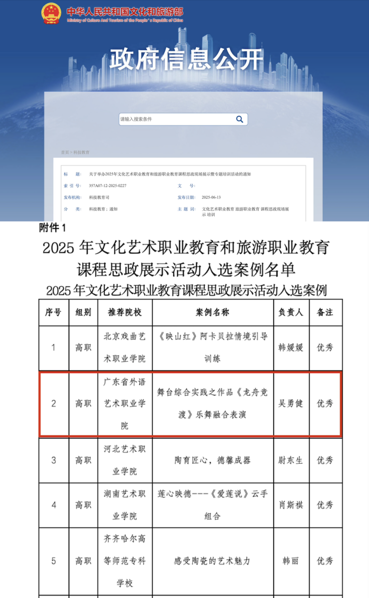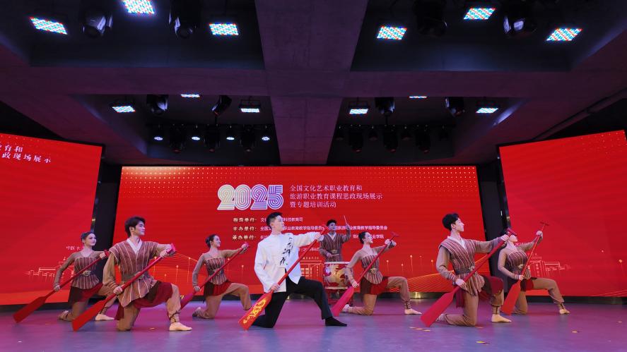 近日,由文化和旅游部科技教育司指导,全国文化艺术职业教育教学指导委员会、全国旅游职业教育教学指导委员会主办的“2025年全国文化艺术职业教育与旅游职业教育课程思政展示活动”在湖南长沙举行。演艺学院吴勇健团队(成员:陈路芳、廖予宁、童姗姗、袁文彬)的作品《舞台综合实践之作品<龙舟竞渡>乐舞融合表演》在全国文化艺术职业教育76个案例中脱颖而出,入选全国十大优秀案例(广东高职院校唯一),并进行了现场展示。
