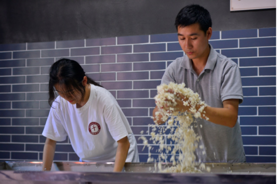 接下来,他带领千网助梦实践队来到堆花米酒的生产制作区,详细地介绍了制作米酒五道工序(蒸饭、捞饭、进大缸、进小缸和蒸酒)。他说堆花米酒制作首先必须选用十几种中草药秘制而成的酒曲,才能保障米酒的色清、气香、味醇。其次,米酒要达到堆花的效果,必需蒸馏到五十五度以上的酒精度数才能做到。