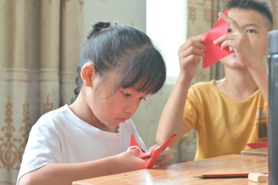 图:手工课上,孩子们兴致勃勃学剪五角星