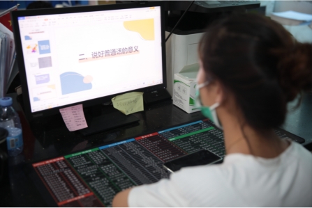 在“云”宣讲课堂上,国家级普通话测试员、广东省普通话测试一级复审专家李云霞结合习近平总书记关于语言文字的重要论述精神和连山少数民族普通话使用情况,为新溪村村干部、青壮年进行宣讲及培训。“这种线上宣讲的形式好呀,坐在办公室就能听讲座学习,还能进行线上语音互动,真心点赞!”新溪村党员杨超玲满意地告诉实践队队长廖梓榕。