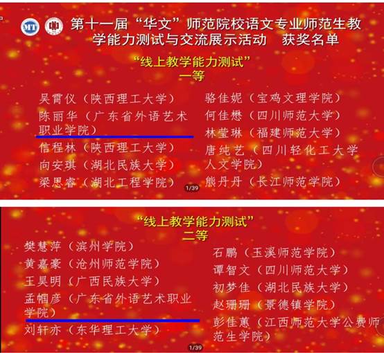 11月5日至6日,在江西师范大学举行的第十一届“华文”全国高等院校语文专业师范生教学能力线上测试与交流展示活动如期开展。我校基础教育学院语文教育专业陈丽华、孟帼彦两名选手与来自全国近80所院校以本科生、研究生为主体的500多名参赛选手同台竞技,分别获得线上教学能力一、二等奖,教学设计能力均为二等奖的佳绩。