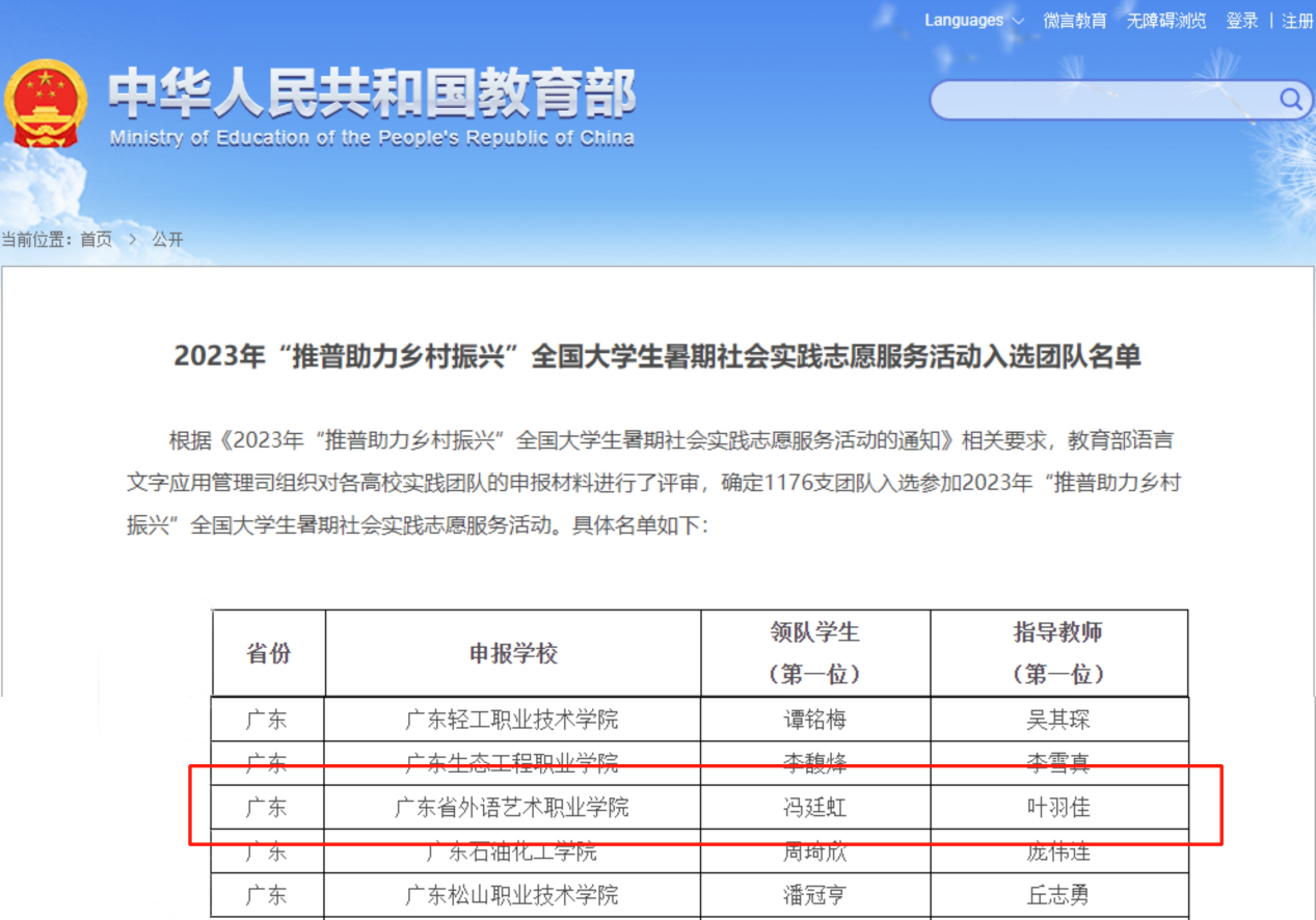 我校微光实践队入选教育部2023年“推普助力乡村振兴”全国大中专学生暑期社会实践志愿服务活动