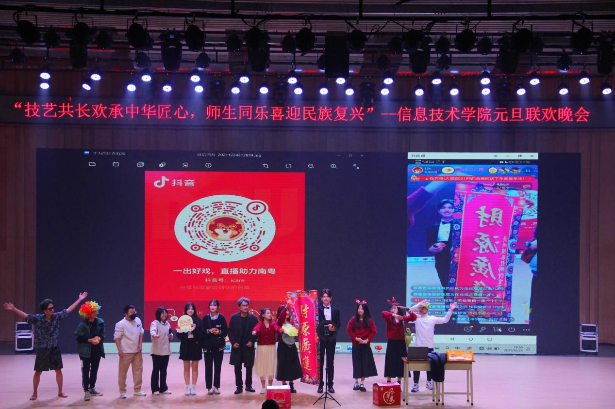 为了营造师生同乐,喜庆祥和的新年气氛,晚会还邀请了学院师生代表带来创意走秀,现场掌声不断,惊喜连连。同时结合学院专业特色,信息学子通过小品《一出好戏,直播助力南粤》,体现网络直播为新时代全面推进乡村振兴的信息化优势,展现了信息学子在“乡村振兴”进程中做出的青春力量。
