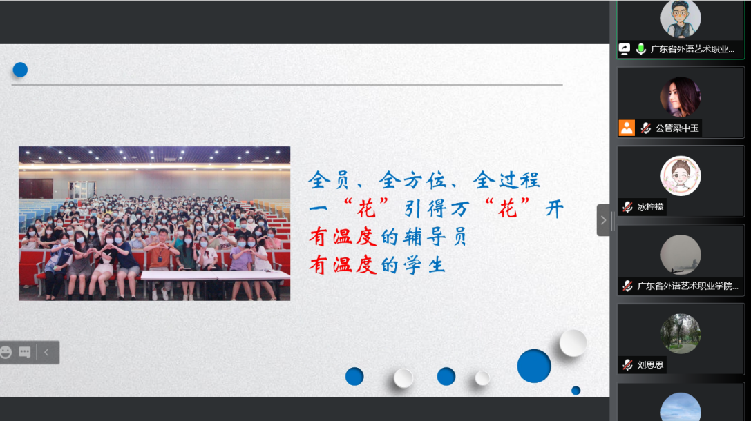 会后,与会老师们表示线上研讨活动形式新颖、效果优越,不但加强了辅导员之间对于学生教育管理经验的分享、交流和学习,而且为做好学生教育管理工作提供了广阔的平台,受益匪浅。立德树人是高等学校的根本任务,“三全育人”工作是实现这一根本任务的有效途径,如何将“三全育人”同日常学生教育管理服务有机创新结合,这一问题值得所有老师共同思考。