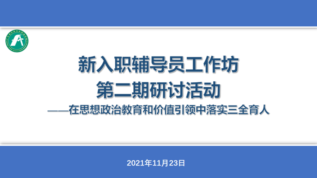 11月23日,我校2021年新入职辅导员工作坊第二期培训如期进行,本期培训采用分校区线上研讨的方式开展,研讨的主题为“如何在学生教育管理服务中落实三全育人”。本期工作坊线上研讨邀请了学生工作部部长、工作坊主持人曾祥翼出席。