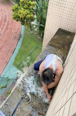 物业人员对各校区各楼栋楼顶天面、地下排水管道、沟渠、涵道、集水口及其他建(构)筑物进行淤积清理和疏浚,对林木枯枝落叶进行修剪清扫、对抽排水井设备进行检修检查。同时,还对防洪抗汛物资备料备勤、加固门窗防风防雨措施、排查校园易引发滑坡或地陷的次生灾害问题进行认真排查,发现一个问题解决一个问题,消除各类潜在危险,确保学校人、财、物的安全。