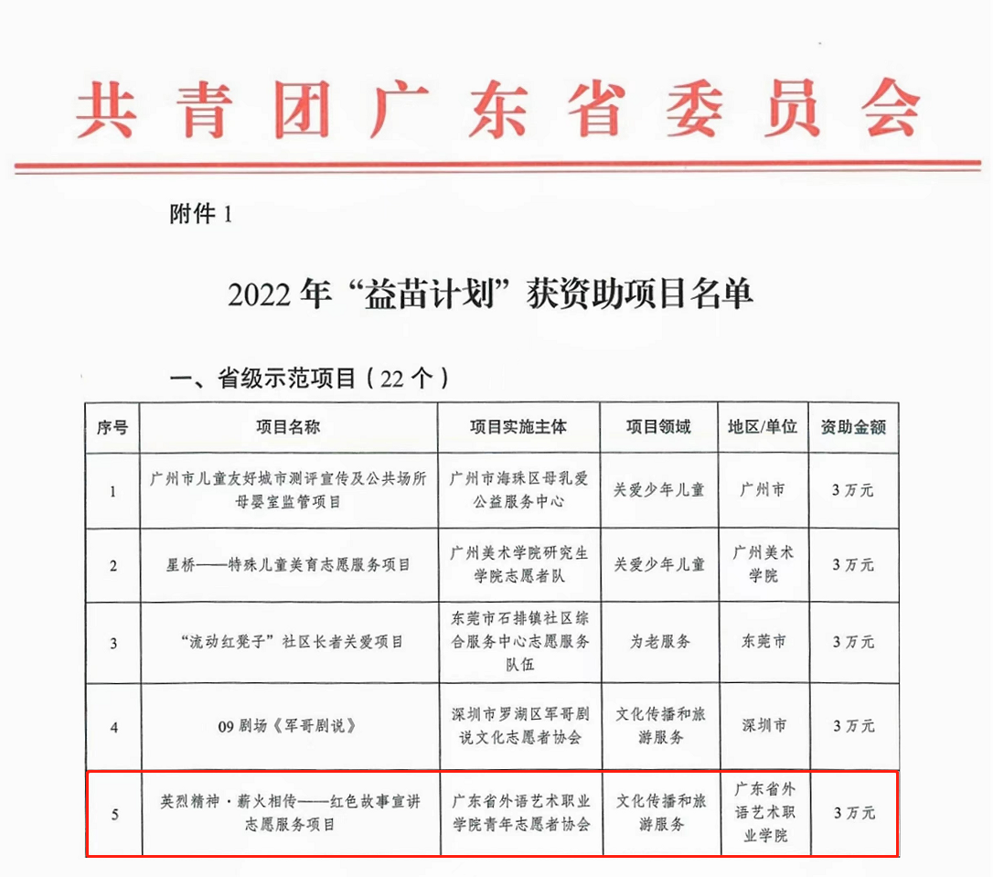 近日,由团省委、省文明办等联合主办的2022年“益苗计划”——广东志愿服务组织成长扶持行动暨志愿服务项目大赛公布评选结果,我校在此项赛事中实现了从0到1的突破,由校团委和青年志愿者协会打造的“英烈精神·薪火相传”——红色故事宣讲志愿服务项目获评省级示范项目。此项目从全省1200多个项目中脱颖而出,成为22个“省级示范项目”之一,获得资助资金3万元,成功挺进国赛。