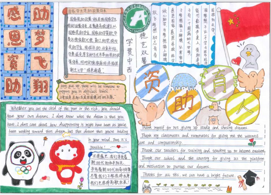 3月下旬,外语外贸学院举办了“感恩励志成才”宿舍海报设计比赛。比赛活动以学院学生宿舍为单位,鼓励同学们发挥特长,将资助政策融入到宿舍文化中,以绘画、海报创作、设计等形式进行比赛。经过一周多的时间,同学们紧扣宣传资助政策主题设计出内容丰富、层次美观、惟妙惟俏的海报。通过本次比赛,我院将资助政策融入到宿舍文化建设中,不仅起到了宣传学生资助政策作用,在宿舍中营造感恩互助的良好育人氛围,也进一步加深了宿舍成员间的感情。