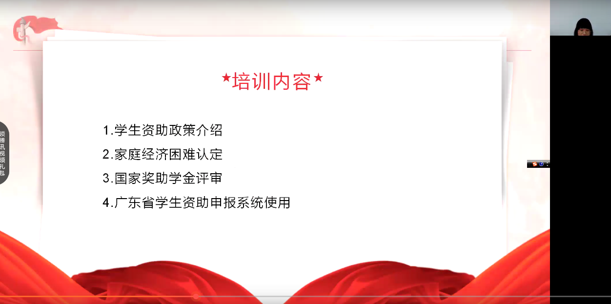 会上,学生资助管理中心张金华详细解读了我校各项资助政策,并围绕家庭经济困难认定、国家奖助学金评审具体业务进行了专题培训,张梦莹针对“广东省学生资助申报系统”使用进行了专题培训。