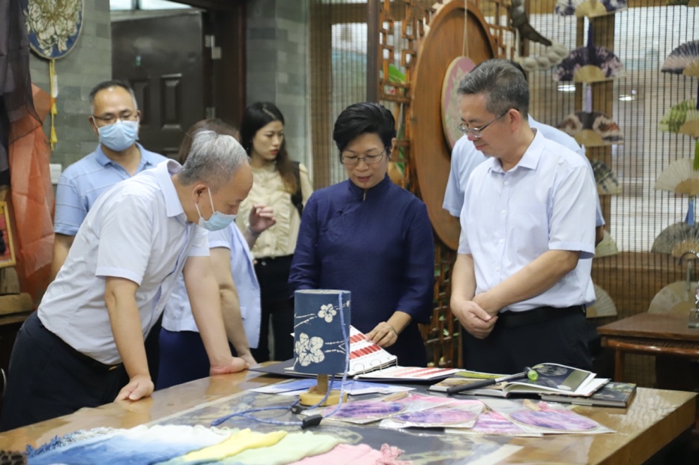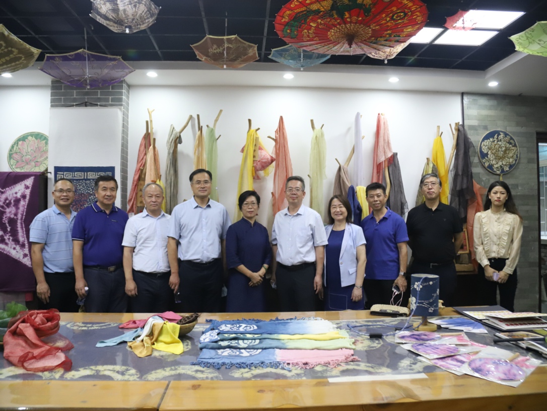 在尹春洁劳模创新工作室,全国优秀教师、我校创新创业学院院长尹春洁教授为陈希原一行介绍了工作室的基本情况,并展示了独特的植物扎染工艺和极具创意的染色设计。或是结合传统节日特色,或是结合清雅的古典元素,并带领大家参观了扇子、丝巾、伞等扎染、蜡染作品,充分展示了传统技艺是如何创新并制作出备受欢迎作品的。