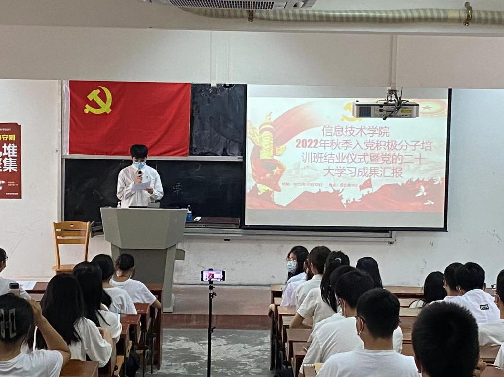 “更加坚定了加入中国共产党的决心和信心”“课程内容很丰富,课程形式很多元”在参加了为期10天、累计12节党课的信息技术学院入党积极分子培训班后,学员们纷纷发出这样的感叹。为落实《中国共产党发展党员工作细则》要求,做好新形势下发展党员工作,确保发展新党员的质量,10月11-25日信息技术学院在信息楼举办了学院2022年秋季入党积极分子培训班,157名学员参加了此次培训班。
