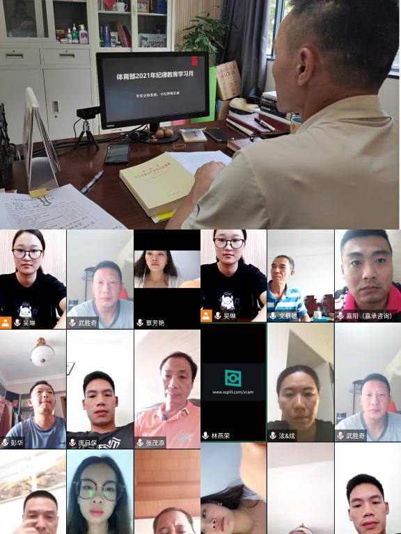 为深入学习贯彻习近平新时代中国特色社会主义思想,贯彻落实习近平总书记在十九届中央纪委五次全会、党史学习教育动员大会、庆祝中国共产党成立100周年大会上的重要讲话精神,充分发挥全面从严治党引领保障作用,坚定不移深化反腐败斗争,体育工作部于9月16日上午,在五山校区办公室召开9月纪律教育学习和师德师风建设工作视频会议,会议由体育工作部主任林燕荣主持,体育工作部全体教师参会。