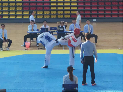 由体育部教研室主任彭华带领的25名校跆拳道运动员,在品势赛项中,一招一式开合有序,形神兼备、刚柔并济,尽显跆拳道的魅力;在竞技比赛中,腿法为主,拳脚并用,以刚制刚,直来直往,尽显跆拳道的速度与力道,更是传递着礼仪、廉耻、忍耐、克己、百折不屈的跆拳道精神。