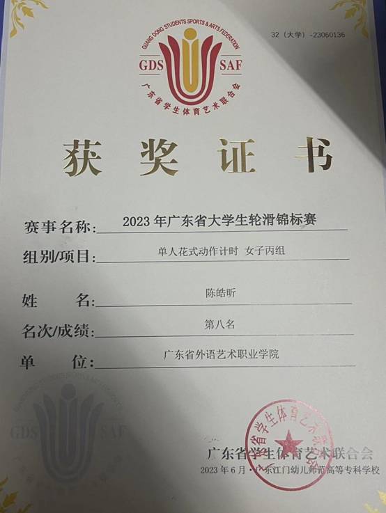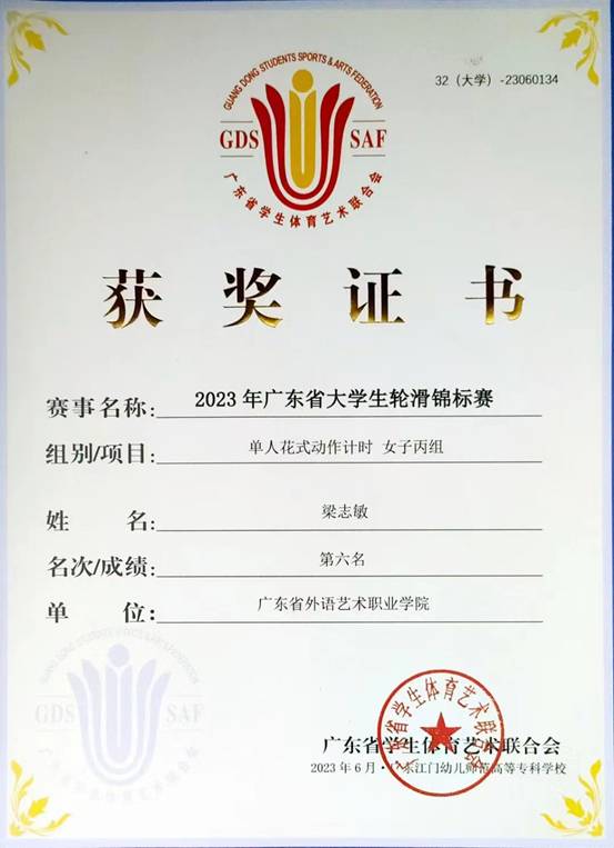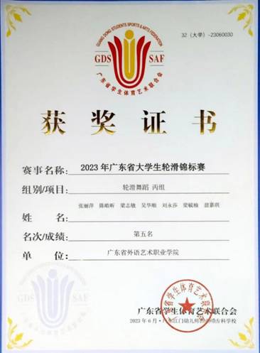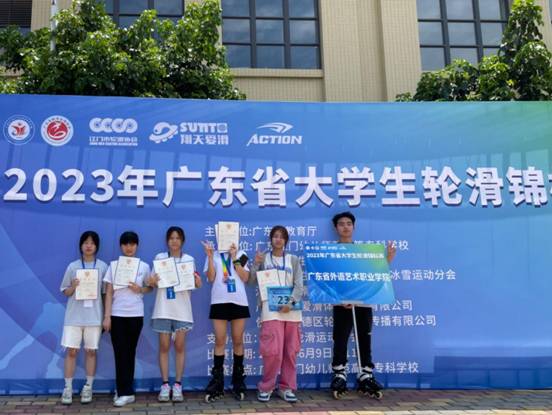 2023年广东省大学生轮滑标赛于2023年6月9日-11日在广东江门幼儿师范高等专科学校体育馆举行。本次大赛设有单人花式动作计时、花式刹停、轮滑舞蹈等六个项目,共有近30所高校,近400名运动员脚踩“风火轮”,亮相轮滑赛场。我校轮滑队在领队林燕荣,教练员吴琳的带领下,共派出了七名运动员参赛,赛出了水平、赛出了风格,斩获佳绩。其中,张丽萍获得个人项目女子花式刹停“第三名”,梁志敏和陈皓昕分别获得女子单人花式动作计时“第六名”、“第八名”,团队项目参赛七人参加轮滑舞蹈荣获“第五名”,为学校赢得了荣誉。