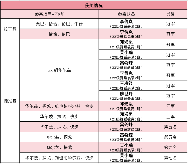 此次比赛,校体育舞蹈队同来自全国大专院校体育舞蹈专业选手同场竞技,历经小组预赛-复赛-半决赛-决赛4轮激烈角逐。为了能在比赛中胜出,他们日夜苦练、不畏艰辛的坚持;赛中,展现出了良好的竞技状态和团队协作能力,不畏强敌的意志,努力拼搏,奋勇争先,终于收获耀眼成绩。