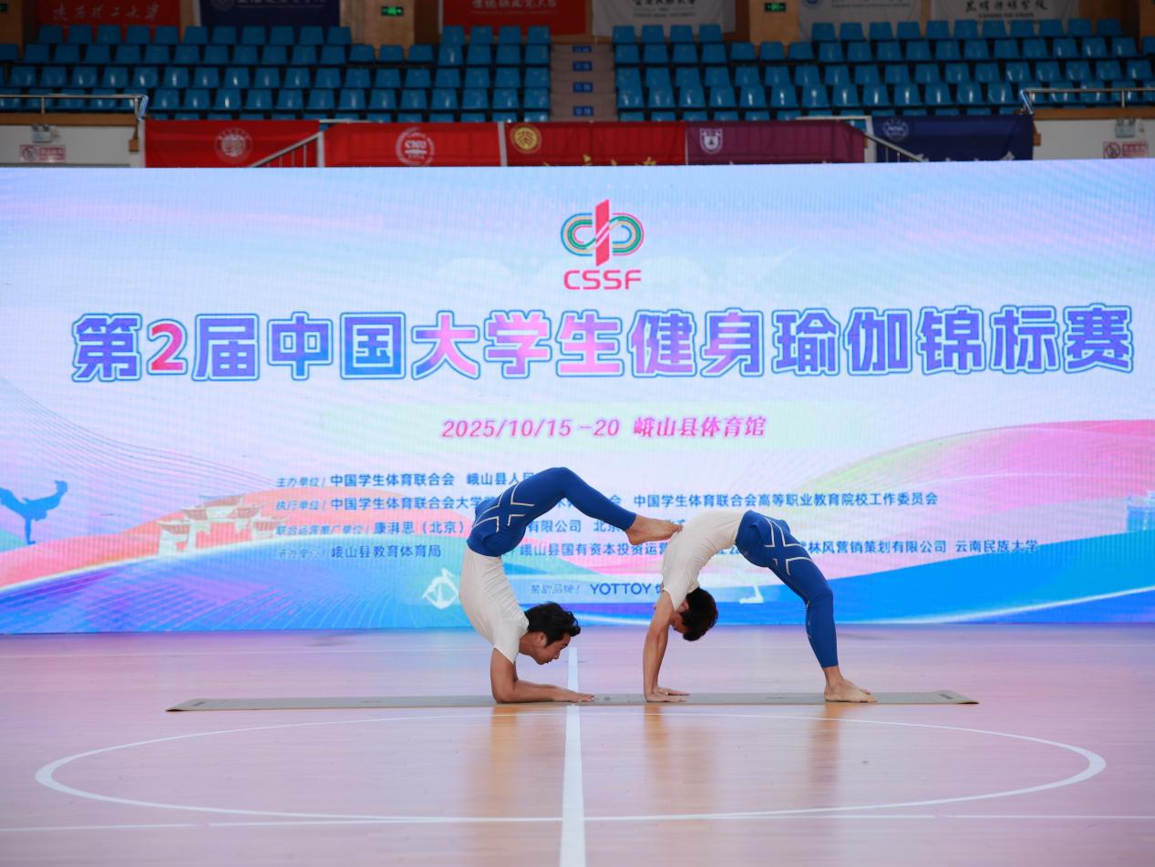 2025年10月15日至20日,由中国学生体育联合会主办的全国大学生健身瑜伽锦标赛在云南省峨山县举行。作为国内高校健身瑜伽项目中级别最高、影响力最广的竞技盛会,本届赛事汇聚了来自北京大学、首都师范大学、南京大学等全国52所高校的427名运动员同台竞技,竞争激烈,整体水平出众。学校在乙健身瑜伽队在领队林燕荣、教练员余喜娜的带领下共派出两名运动员,勇夺A组男子双人二级自选项目冠军,在全国性舞台上充分展现了卓越的技艺与昂扬的风采。