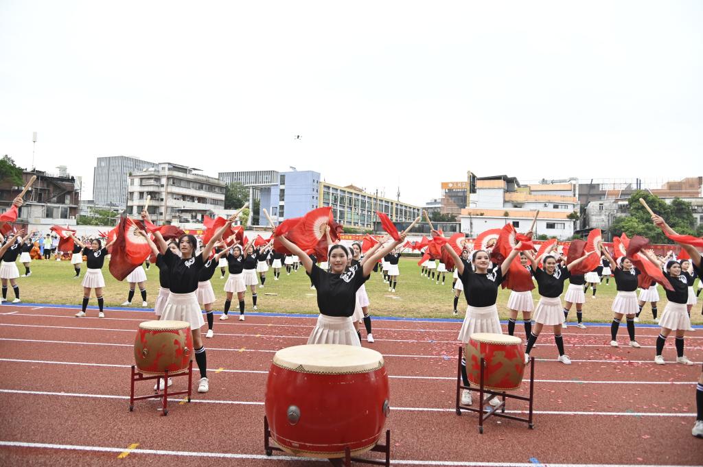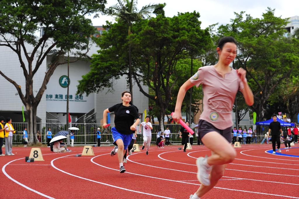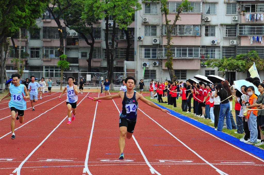 进取。接力赛上,运动员奋起直追,完美诠释了远处校训墙“进取”二字。
