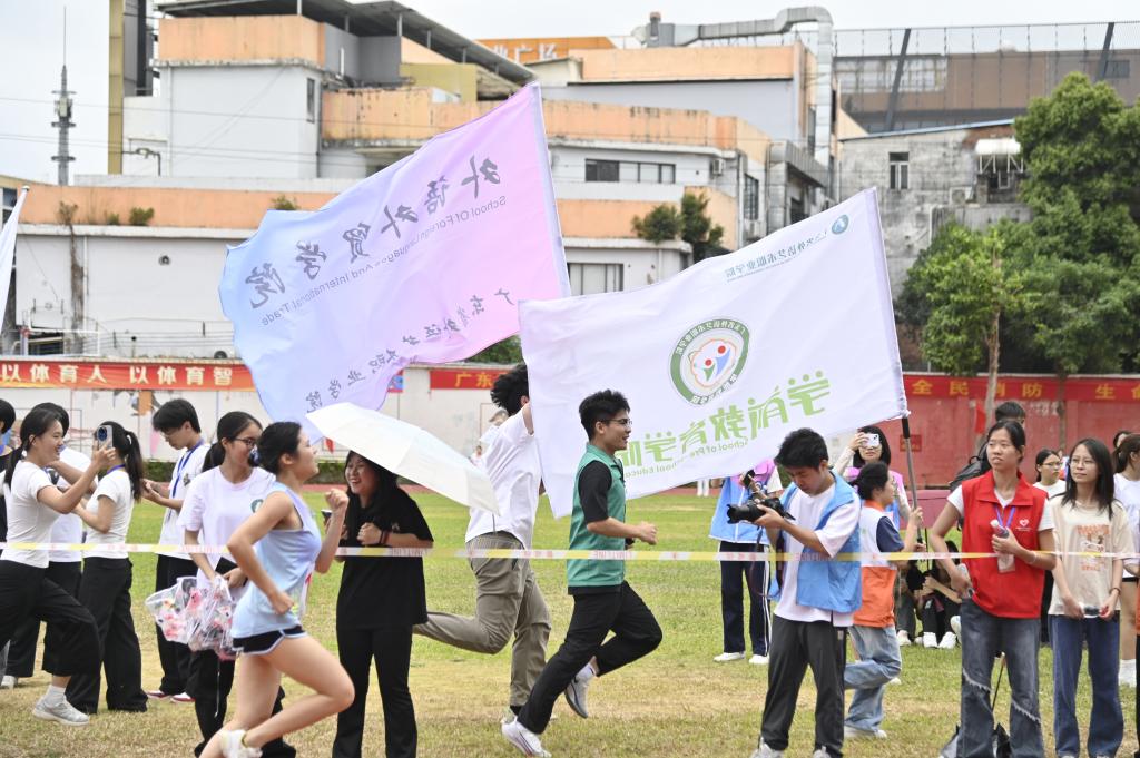陪伴。陪跑志愿者高举院旗,全力跟跑,用呐喊和脚步为选手加油鼓劲。