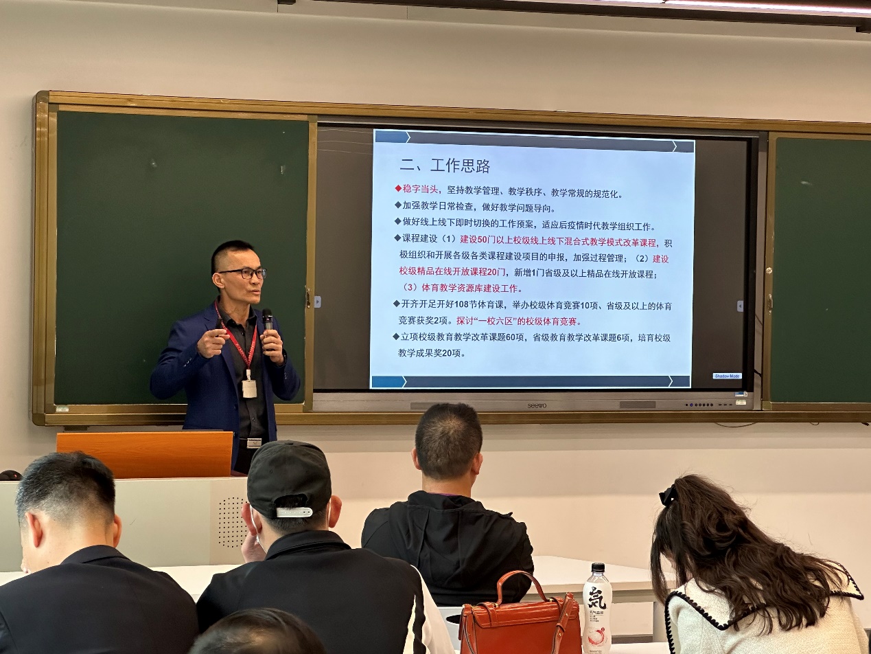 会上强调,加强各校区之间的教研活动,系统科学地进行体育教研,积极实践探索体育教学改革,让体育课堂活起来、动起来;积极创建各个项目的线上课程,加快推进体育教学资源库建设工作,鼓励参加校级教学能力大赛;用心用力用功做好课题研究和论文撰写,提升科研能力;逐步探索建立“一校六区”的校级体育竞赛机制。