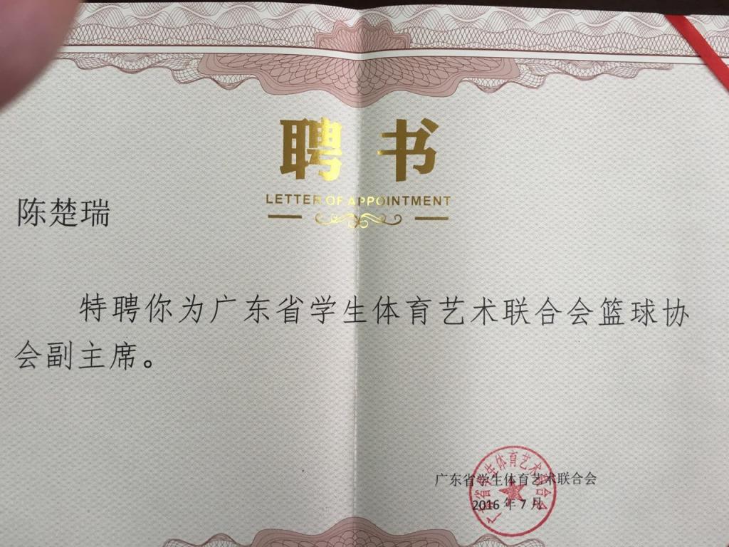 在刚刚结束的广东省学生体育艺术联合会篮球协会成员授聘仪式暨裁判员工作会议上,我校党委副书记、纪委书记陈楚瑞被聘为广东省学生体育艺术联合会篮球协会副主席。