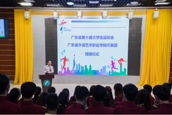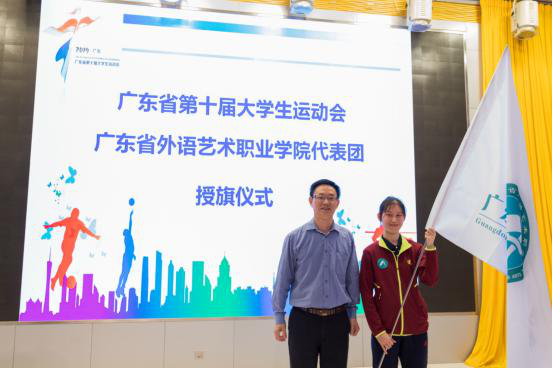 图:学校党委副书记、纪委书记陈楚瑞向运动员代表团代表授旗