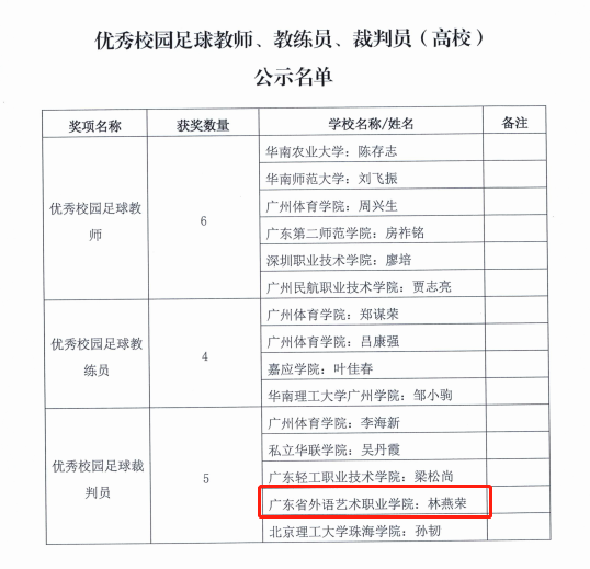 此次总结活动评选出3个优秀试点县(区),1名优秀试点县(区)长,20所优秀特色学校,38名优秀特色学校校长,44名优秀校园足球教师,24名优秀校园足球教练员,9名优秀校园足球裁判员,24名校园足球“未来之星“,4个优秀媒体合作伙伴、1个优秀企业合作伙伴,6个优秀组织奖、3个校园足球“感动人物”奖。我校林燕荣老师获评“优秀校园足球裁判员”,是全省高校5个优秀校园足球裁判员之一。