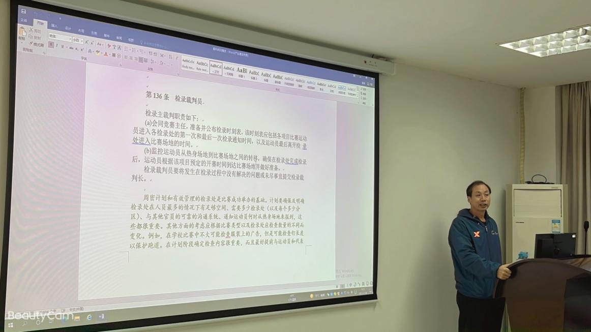 随后,部署学校田径运动会的工作安排。学校田径运动会是学校体育工作中不可缺少的一个环节,对于提升学校体育教学效果、提高学生体育竞技能力,起着非常重要的作用。高效的裁判工作方法是学校田径运动会顺利进行的重要保障。国家级田径裁判员张茂添老师为全体教师分享了田径运动会最新裁判规则。