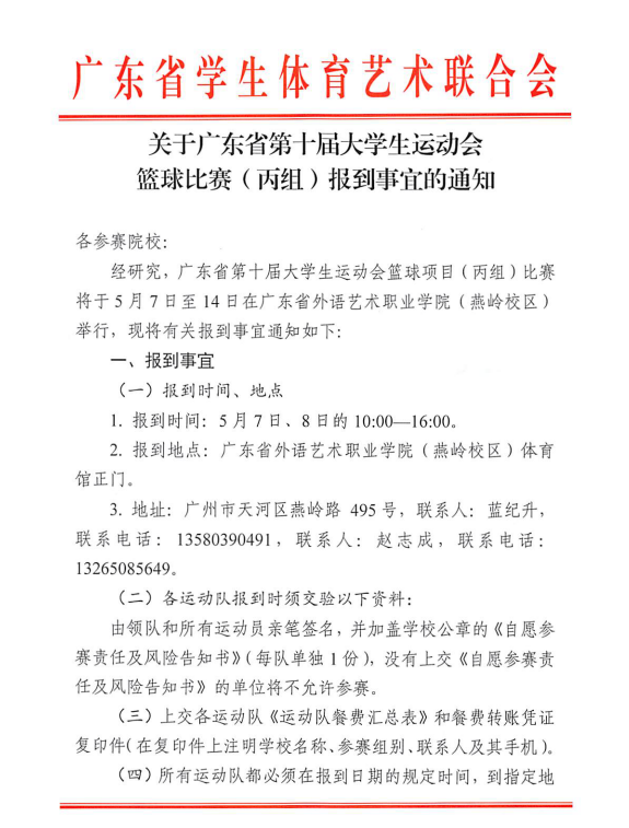 关于广东省第十届大学生运动会篮球比赛(丙组)报到事宜的通知