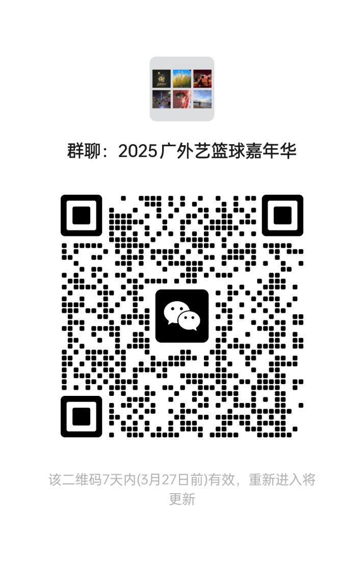 各项目比赛方案及规程将通过微信群发布,不再另行通知。有意报名参赛的同学,请扫码加入“2025广外艺篮球嘉年华”微信群,报名时间自即日起至2025年4月2日;有意向参赛项目(个人或团体)的同学,请扫附件报名的二维码(个人或团体项目报名登记表)填写报名信息。