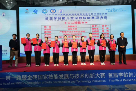 11月21日-24日,2024金砖大赛——首届学龄前儿童保教技能赛项决赛在山东潍坊举行,共有65支来自全国高职院校的优秀团队参与了本次的角逐。在这场竞争激烈的赛事中,我校斩获二等奖。本次赛项由学前教育学院肖美艳、傅君两位教师指导,谢婷婷、唐尧两位同学组成的代表队参赛。