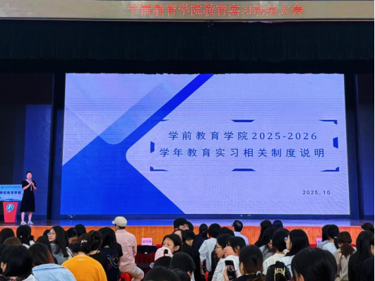 为切实保障2026届毕业生教育实习工作有序开展,帮助学子更好的从课堂走向岗位、从理论走向实践,从“教育学习者”到“儿童成长同行者”的角色转变,2025年10月31日上午,学前教育学院在燕岭校区体育馆召开了2026届毕业生教育实习动员大会。