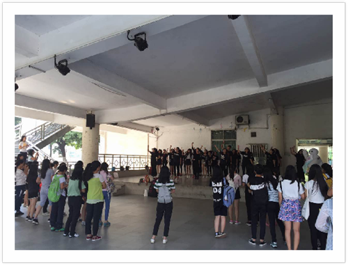 师姐们早早聚集在小舞台等待快闪的开始。活动未开始,身着统一黑色色调的服装就吸引了众多同学的目光。大家纷纷驻足观看,等待师姐们的精彩亮相。