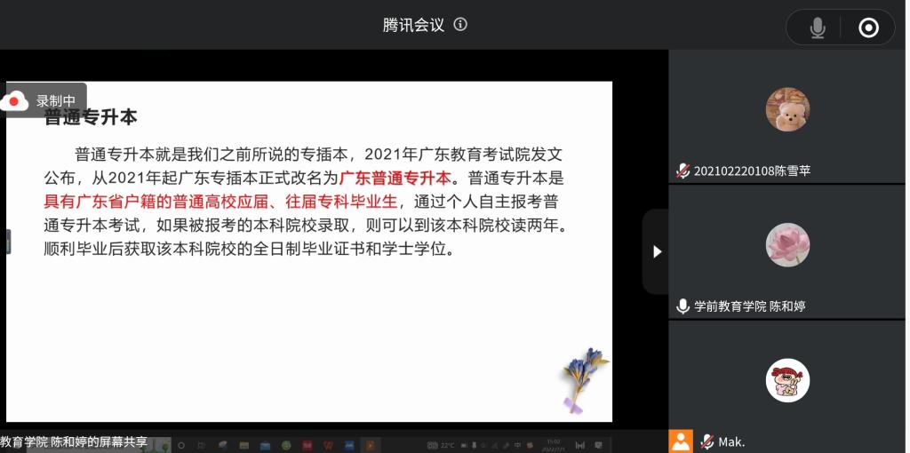 为帮助学前教育专业学生科学备考,7月1日下午,学前教育学院举办了2023届学生专插本分享讲座第二讲,本次讲座邀请了成功考取广东第二师范学院的2019级学前教育专业陈和婷同学主讲。学前教育专业2020级和2021级学生参加讲座。