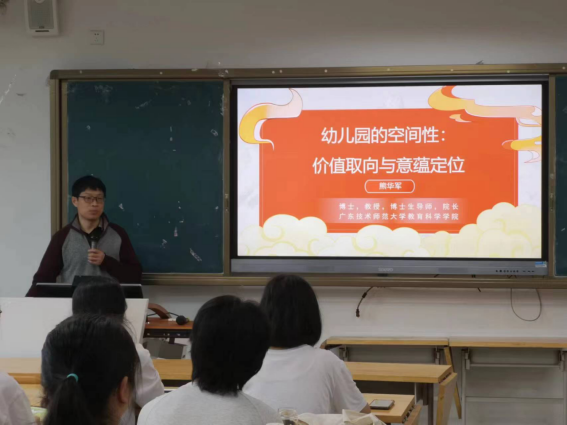 在学术引领方面,4月29日学院请来了广东技术师范大学教育科学学院的熊华军院长,给大家开展了一场学术指导讲座——《幼儿园的空间性:价值取向与意蕴定位》,让同学们受益匪浅。熊院长的讲座通俗易懂而又幽默风趣,通过引入丰富有趣的案例深入浅出地向学生讲述他对幼儿园空间的独特理解,进而帮助大家重新解读幼儿园教育。在讲座中他指出:“建筑应是与事件相生相随的空间,幼儿园最缺少的是对于空间的布置,我们应当重视幼儿园的空间性,利用它的价值取向与意蕴定位为幼儿提供展示多元自我的场所。