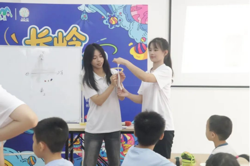 图:实践队队员向孩子们展示实验现象