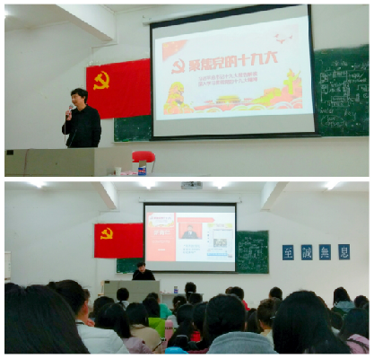 接着,刘教授以《聚集党的十九大》为主题,以“新青年”为切入点解读十九大报告,将党的理论知识结合同学们的日常生活,娓娓道来。他说“蓝图已经绘就,号角已经吹响,让我们撸起袖子加油干,永做时代人,做担当民族复兴大任的新青年。”全体同学在刘教授旁征博引的讲解下,对党的认识以及对党的十九大精神有了更深一层的了解。