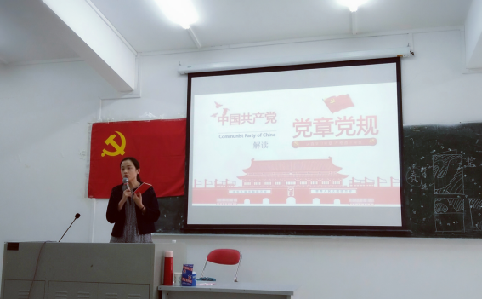 党课初始,许老师指出“国有国法,党有党规,党章是最根本的党内法规。”接着许老师从十九大对党章的十项重要修改,以及“党章的地位和作用”、“党章的历史和内容”、“遵守党章做合格党员”四个方面对《中国共产党章程》进行了深度解读,给全体团员讲授了一节生动的党课。