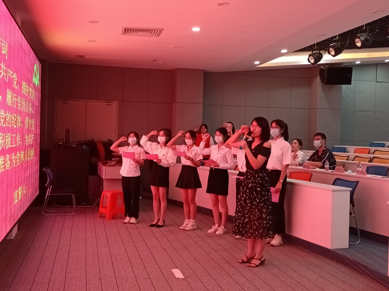 接着,便到了激动人心的时刻。刘老师带领七位预备党员上台宣誓,誓言铮铮、掷地有声,洪亮的声音和紧握的拳头表达了党员们坚定不移听党话、跟党走的信念和决心。