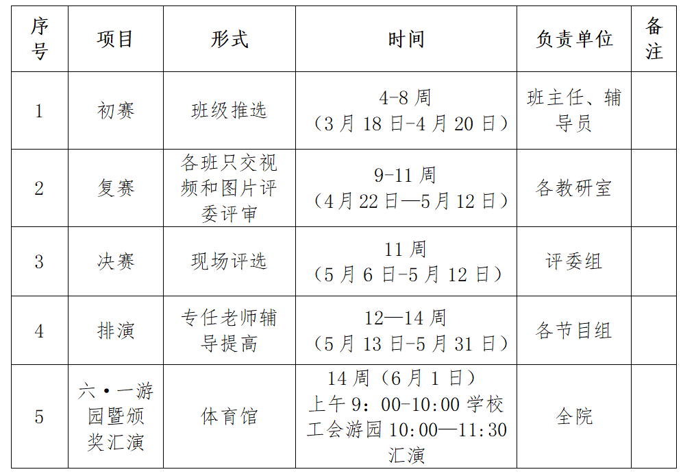 在全院招标5个团队来分别承办弹、唱、跳、画、说五项活动,每项活动需要经过初赛、复赛、决赛、排演,最终挑选出每个活动的前1-2名上舞台参加全校工会举办的“六一”汇演。