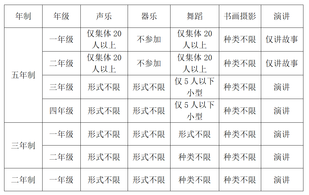 以班级为单位组织,毕业班原则上不参加本次活动,按照弹、唱、跳、画、说每个班级推选不少于3个不同类的节目,每个节目不超过3—8分钟。可以跨班组队,跨班组队的,只能归属在一个班。具体参加年制如下: