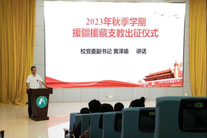 为落实省委省政府关于教育援疆、教育援藏的部署要求,本学期我校选派了16名同学前往新疆伽师和西藏林芝地区开展支教活动。8月29日,我校举行2023年秋季学期援疆援藏支教学生出征仪式,学校党委副书记黄泽瑜、学生工作部负责人、基础教育学院、外语外贸学院、学前教育学院党委书记、副书记及支教学生辅导员,全体支教学生参加了本次活动。