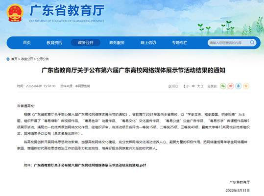 近日,广东省教育厅公布了第六届广东高校网络媒体展示节活动结果。我校报送的作品共荣获7个奖项,分别是一等奖2项,二等奖1项,三等奖4项,具体获奖情况如下: