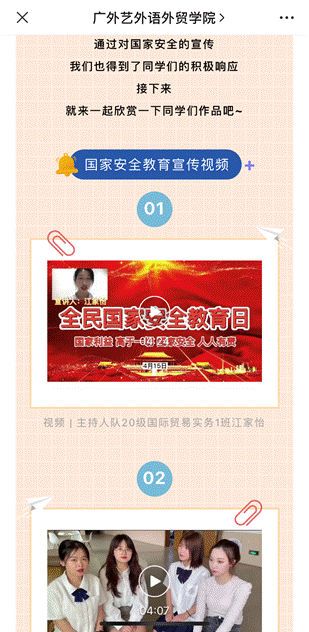 学院将国家安全教育主题安排进五月的班会活动,同时组织学生积极拍摄国家安全宣传小视频,并将优秀视频通过学院公众号进行宣传,以当代大学生喜闻乐见的形式让国家安全意识入脑入心。
