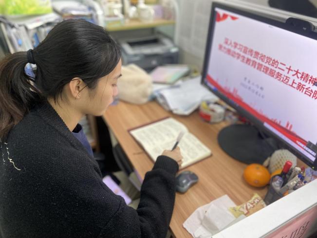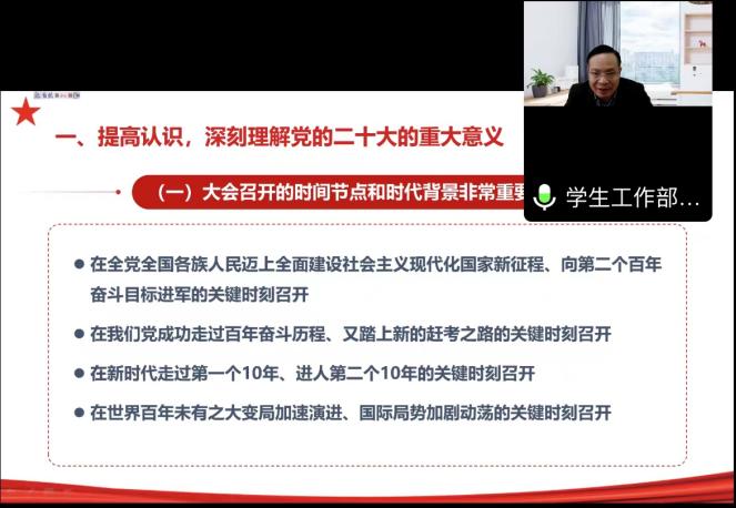 高举伟大旗帜,深刻领会精神。黄泽瑜要求全体学生工作队伍深入学习贯彻党的二十大精神,深刻领会、准确把握大会提出的重要思想、重要观点、重大判断、重大举措,把思想和行动统一到党的二十大精神上来,坚持“自信自强、守正创新,踔厉奋发、勇毅前行”。一是要提高思想站位,充分认识到学习宣传贯彻党的二十大精神是当前和今后一个时期的首要政治任务和全部工作的重心;二是要强化担当意识,要把学习党的二十大精神和立德树人根本要求相结合,和学校、二级学院重点工作相结合,和日常工作相结合;三是要坚持主责主业,动员全体学生认真学习党的二十大精神,用高度、深度、温度引导学生,积极创新学习形式和平台载体,利用好第二课堂。