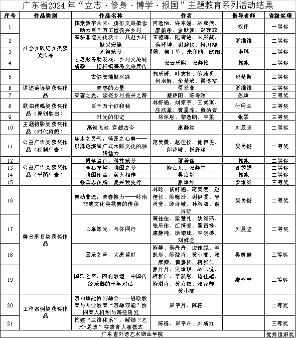 根据《广东省教育厅关于公布2024年“立志·修身·博学·报国”主题教育系列活动结果的通知》,我校师生再创佳绩,共21项作品获奖,其中:一等奖2项、二等奖8项、三等奖11项。同时,我校第八次荣获了该项活动“优秀组织奖”。