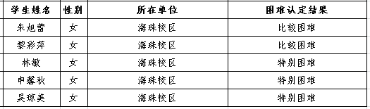 根据《广东省教育厅关于做好我省2020年家庭经济困难大学新生专项资助工作的通知》《金鼎娱乐最新官方网址大学新生资助管理办法》(粤外艺职院学〔2017〕546号)等文件精神。集团办学海珠校区5位同学符合新生资助条件,增补为我校2020年家庭经济困难大学新生专项拟资助对象。现予公示。