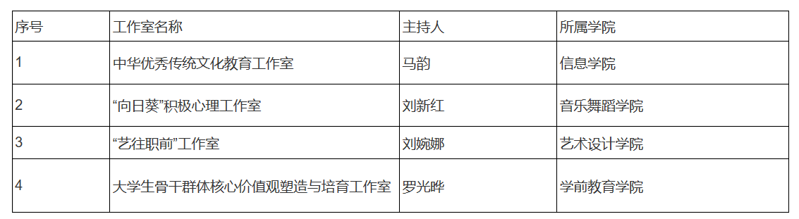 根据《关于印发<金鼎娱乐最新官方网址校级骨干辅导员工作室建设方案>的通知》(粤外艺职院学〔2021〕170号), 经过个人自荐、资格审核、答辩评审等环节,现将第一批校级骨干辅导员工作室建设名单公示如下: