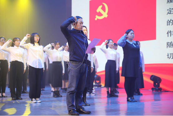 颁奖典礼首先展示先锋模范。2020年新发展的党员代表在广东省高校“双创”党建样板支部、“双带头人”教师党支部书记工作室负责人、外语外贸学院党总支书记潘小波同志领誓下,完成了入党宣誓仪式。希望新一批预备党员牢记入党誓词,学习和践行习近平新时代中国特色社会主义思想,不忘入党初心、争做先锋表率。